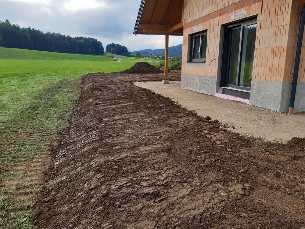 Wenn es um einen Aushub geht, ist es nicht nur wichtig, den Bagger zu bedienen und sorgfältig zu arbeiten. Eine große Rolle spielt auch die Fähigkeit, das abgetragene oder ausgehobene Material einzuschätzen. So können wir zum Beispiel sagen, ob das Aushubmaterial später für die Hinterfüllung verwendet werden kann oder ob die Muttererde geeignet ist, um nach Abschluss der Bauarbeiten für die Gartengestaltung wieder zum Einsatz zu kommen.